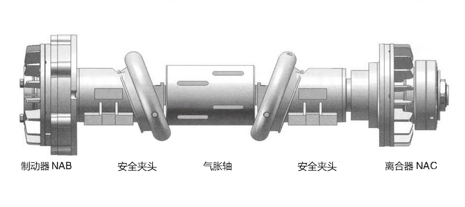 卷取用安全卡盘用于对物料进行卷取或导开,根据需要,它可以与电动机连接做主动旋转,又可以做被动旋转。在输出圆轴上还可以安装手动、气动阻尼器、制动器、离合器,可以调整物料张力。